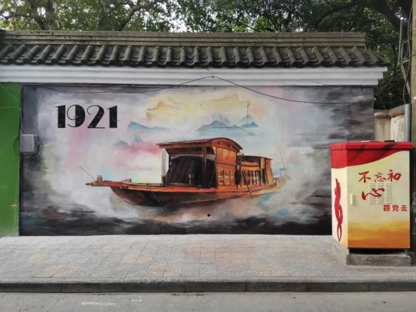 有一面墙上画着1921年嘉兴南湖上的“小舟”。