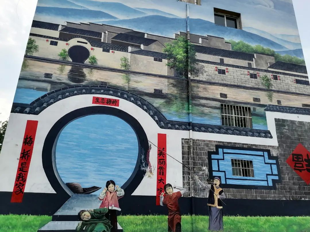 在梅桥镇淝南村,村民住房外墙上,一幅幅巨大的壁画吸引来游人的目光,蓝天、白云、水车、荷塘、潺潺流水、白墙黛瓦,勾勒出村庄的迷人画卷。绘画师们进行现场手绘创作,根据不同墙体的高度和形状,与社会主义核心价值观、美丽乡村、农耕文化等主题相结合,旧墙换新颜,扮靓村居面貌,成为无处不在的风景线。